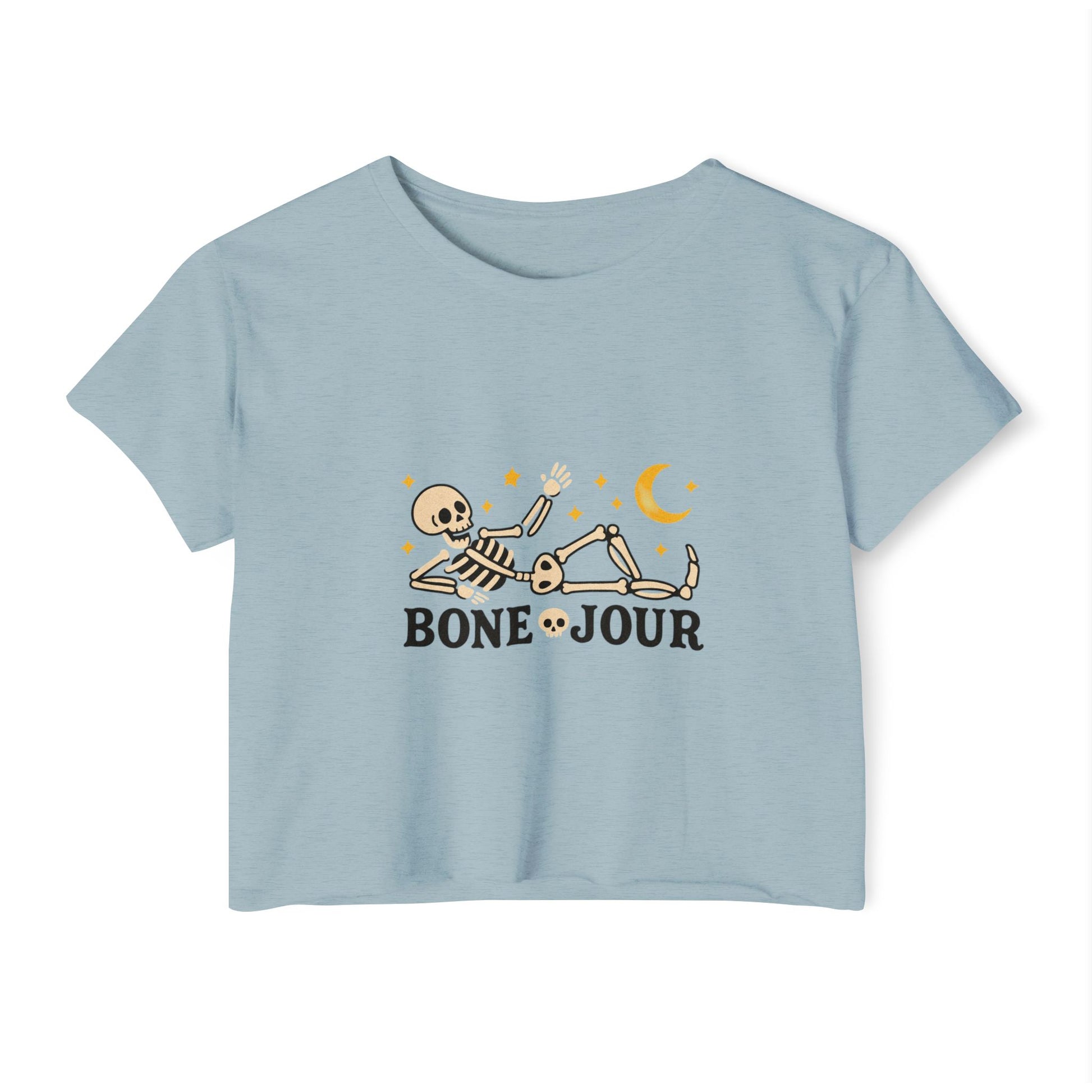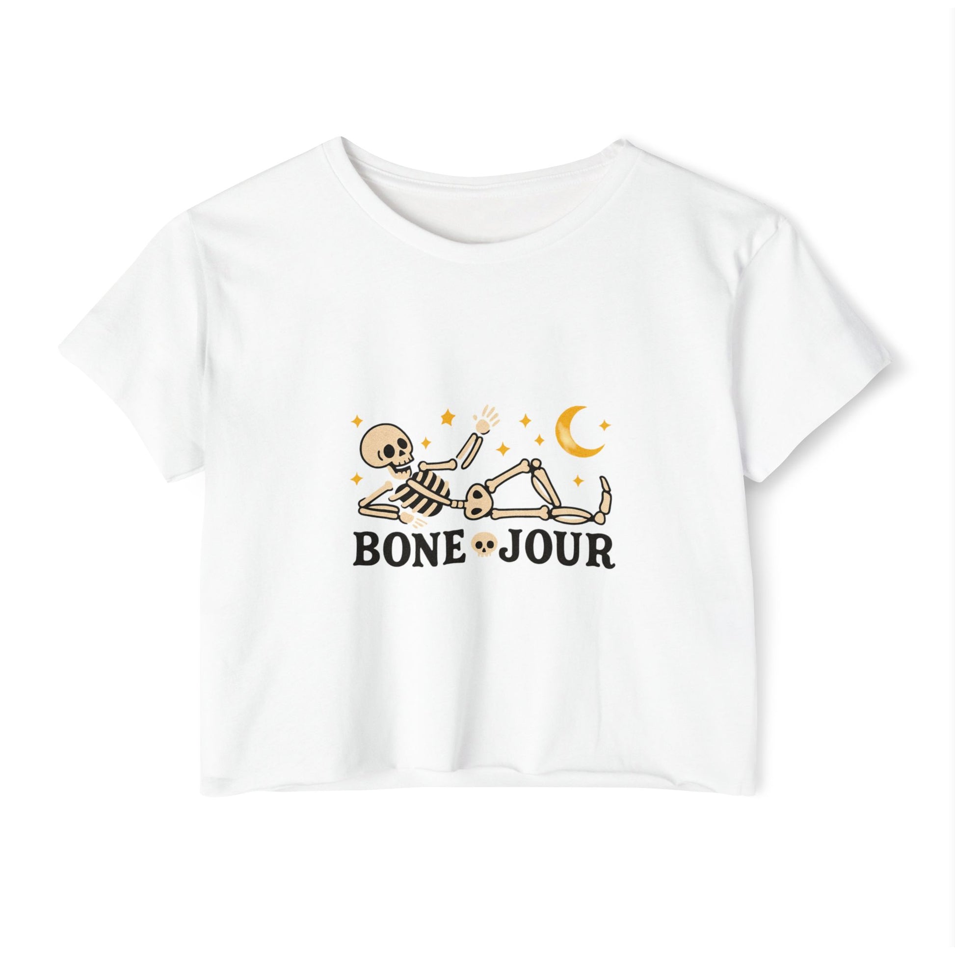 Make a bold statement with the Bone-Jour Crop Top, featuring a cheeky skeleton design that’s a pun-perfect twist on “bonjour.” This playful top blends spooky vibes with everyday style, making it a fun conversation starter wherever you go. Lightweight and flattering, it’s ideal for those who want to show off their quirky side with comfort and humor.